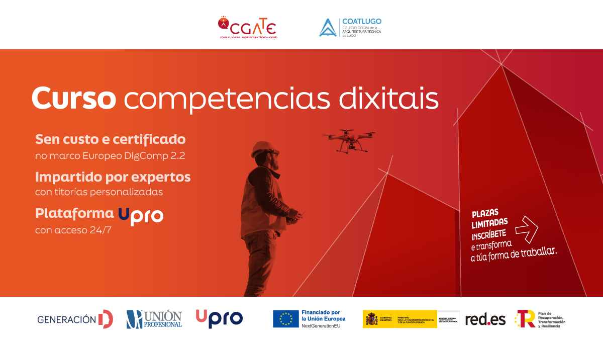 ¡Últimas prazas dispoñibles!Non deixes pasar a oportunidade de impulsar o teu perfil profesional coas ferramentas dixitais que están a transformar a Arquitectura Técnica.Aínda estás a tempo de inscríbete no curso en Competencias Dixitais aplicadas á Arquitectura Técnica, unha formación sen custo, oficial, práctica e flexible deseñada especialmente para profesionais do sector.